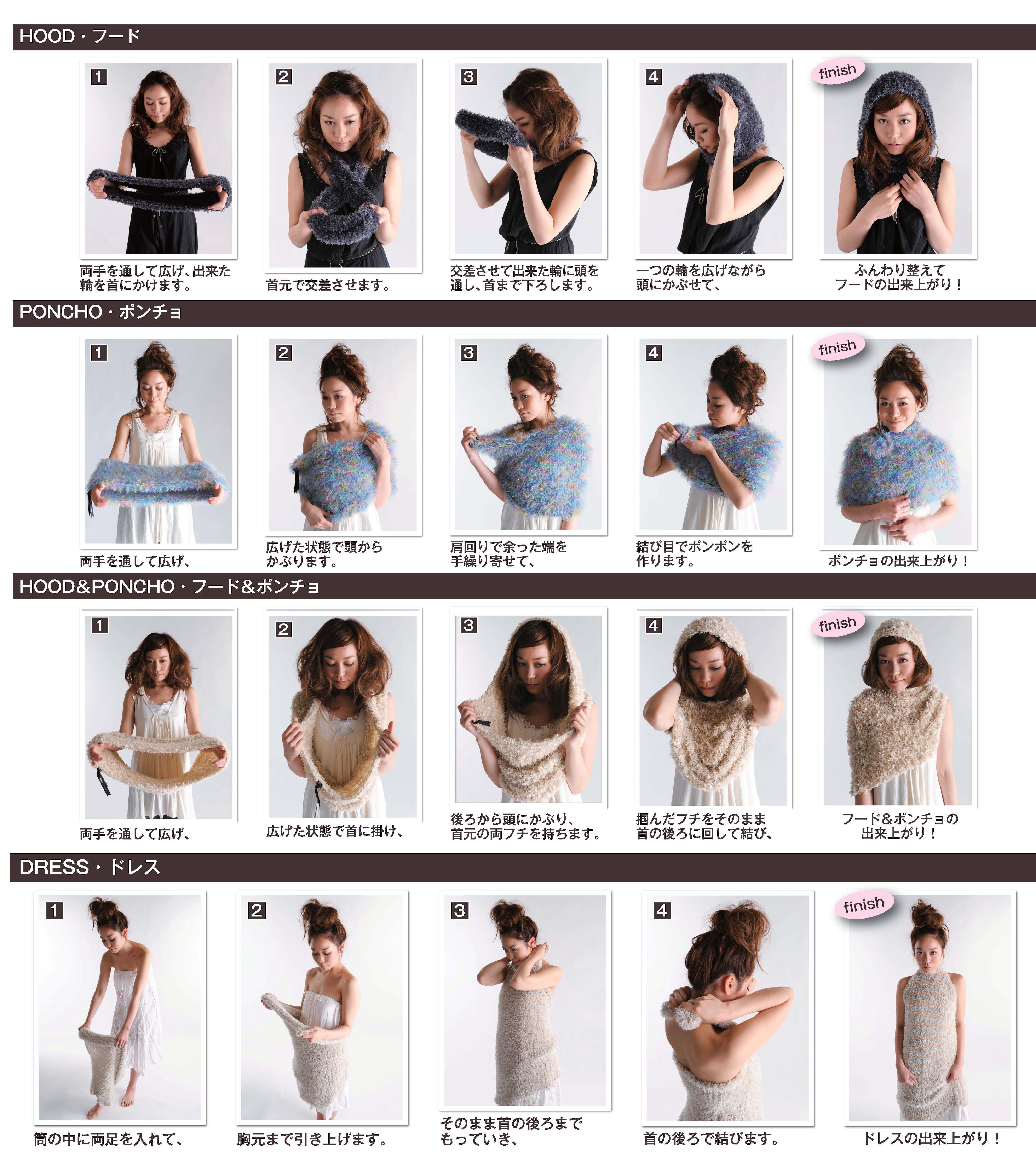 スヌード・ストール・ケープ・ポンチョ・フードなど様々なアレンジが楽しめます。